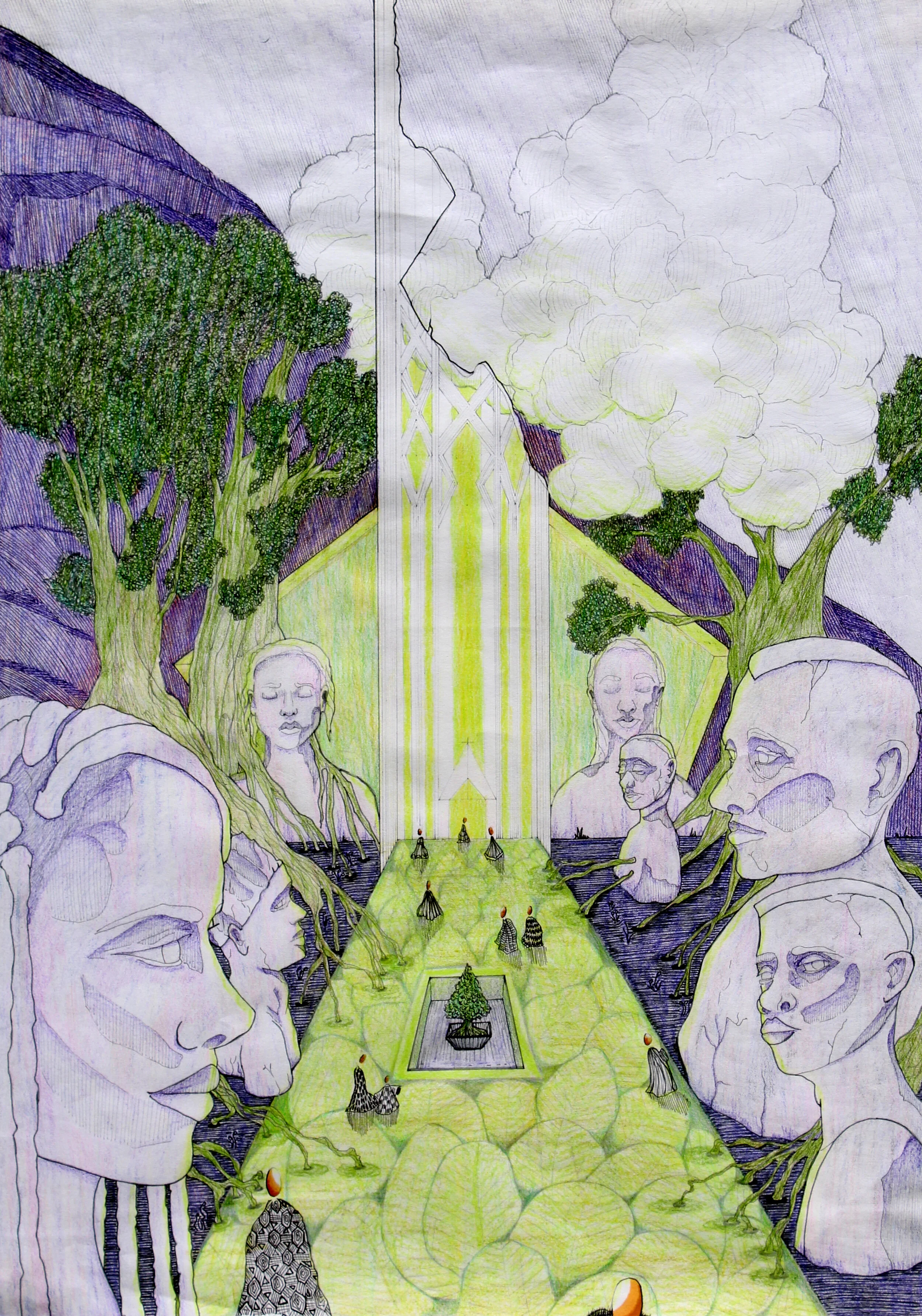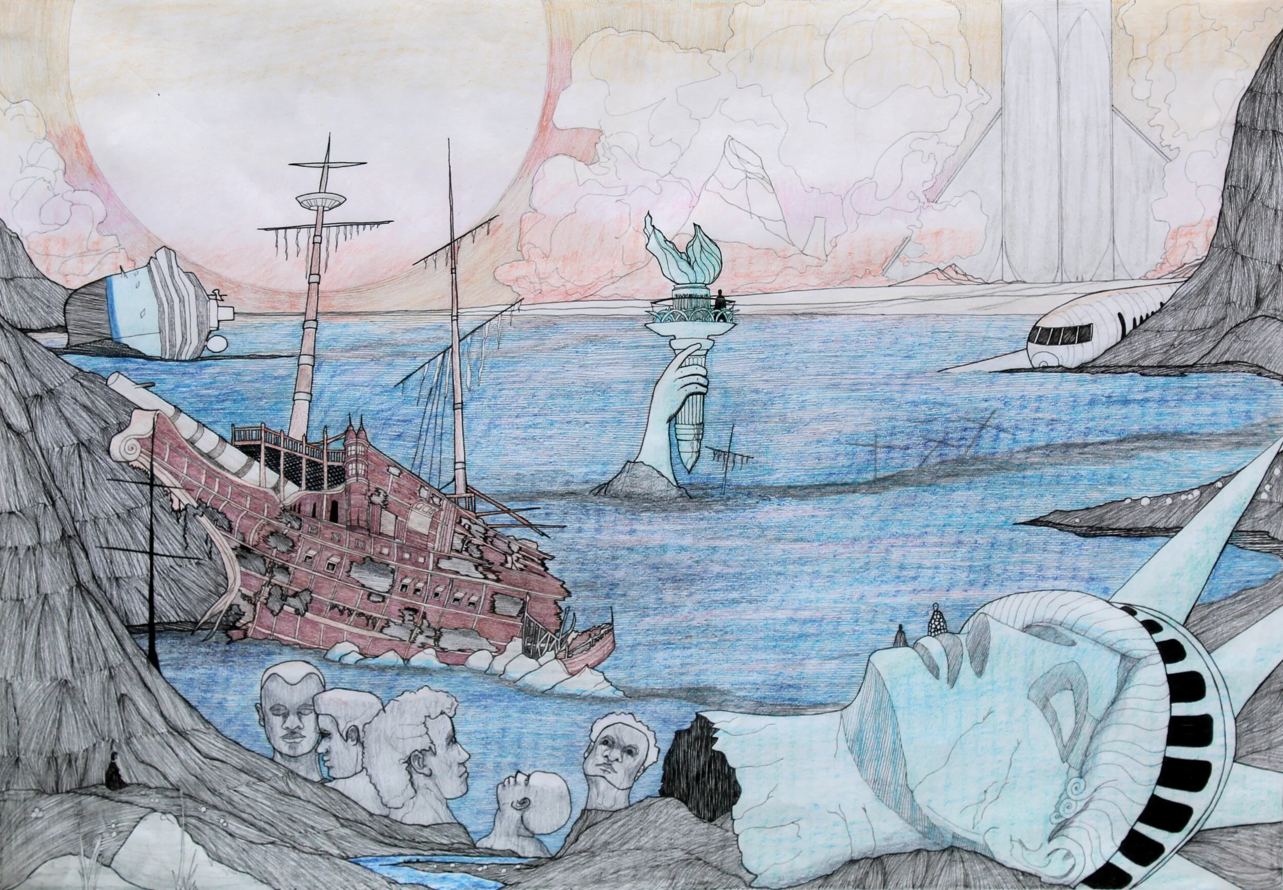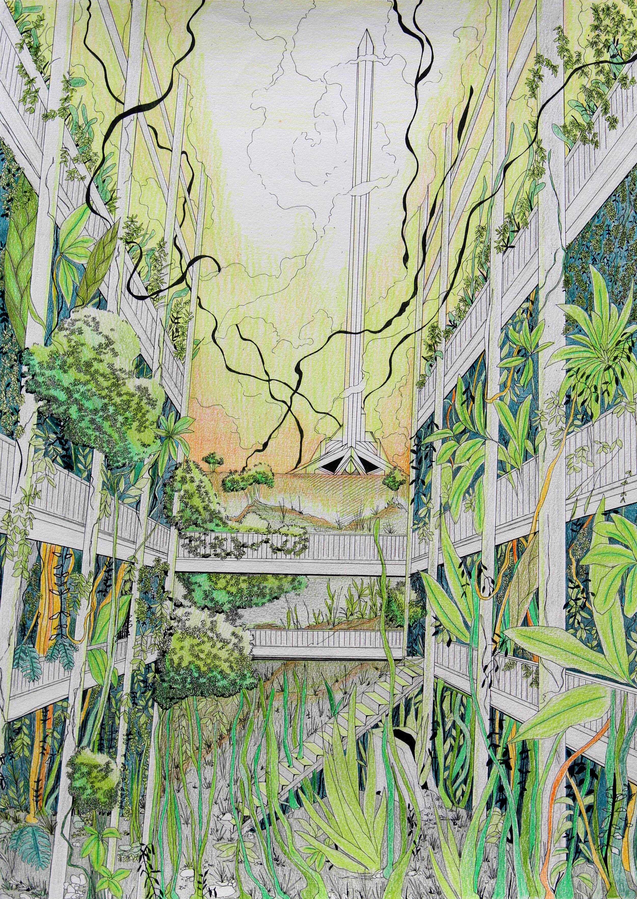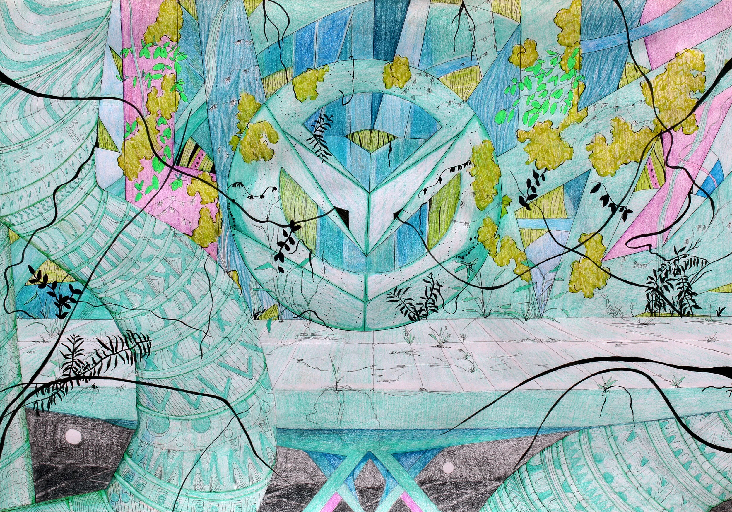 The traveller is a series of drawings in pen and coloured pencil on paper. The series explores the future, 1000 years from now. During the pandemic, I missed travelling and started binging Star Trek (and other sci-fi movies). These pieces are places visited by an interplanetary traveller, visiting earth for the first time. Things are a little different now, as the planet retakes the land. People live closer to nature, recycling old structures. Remnants of automatons, statues and other landmarks still linger. The traveller wonders, “What happened here?”.