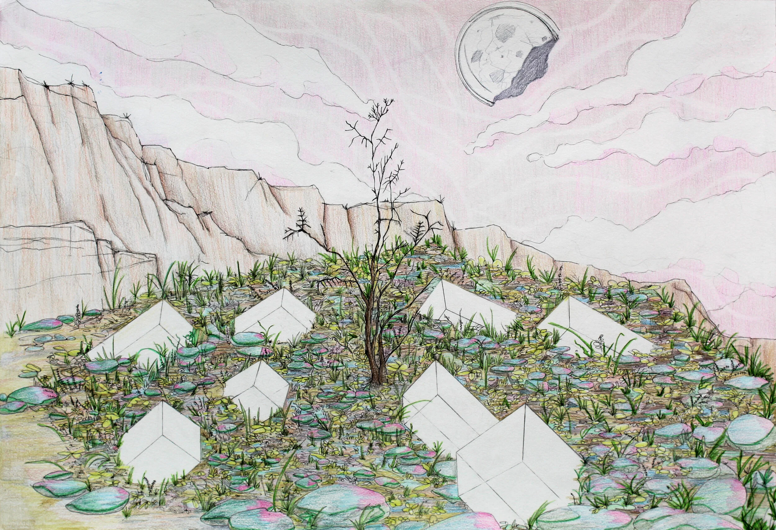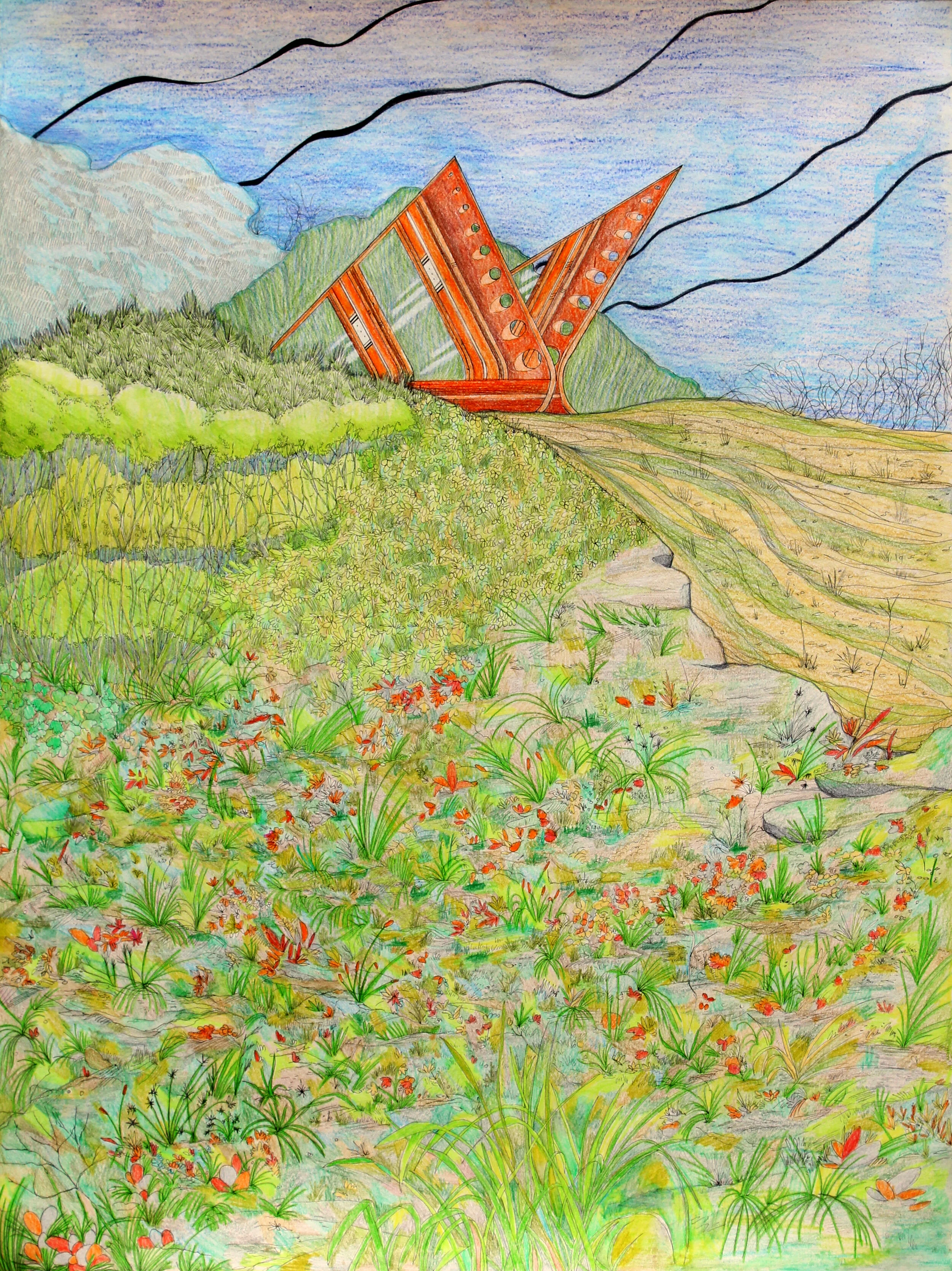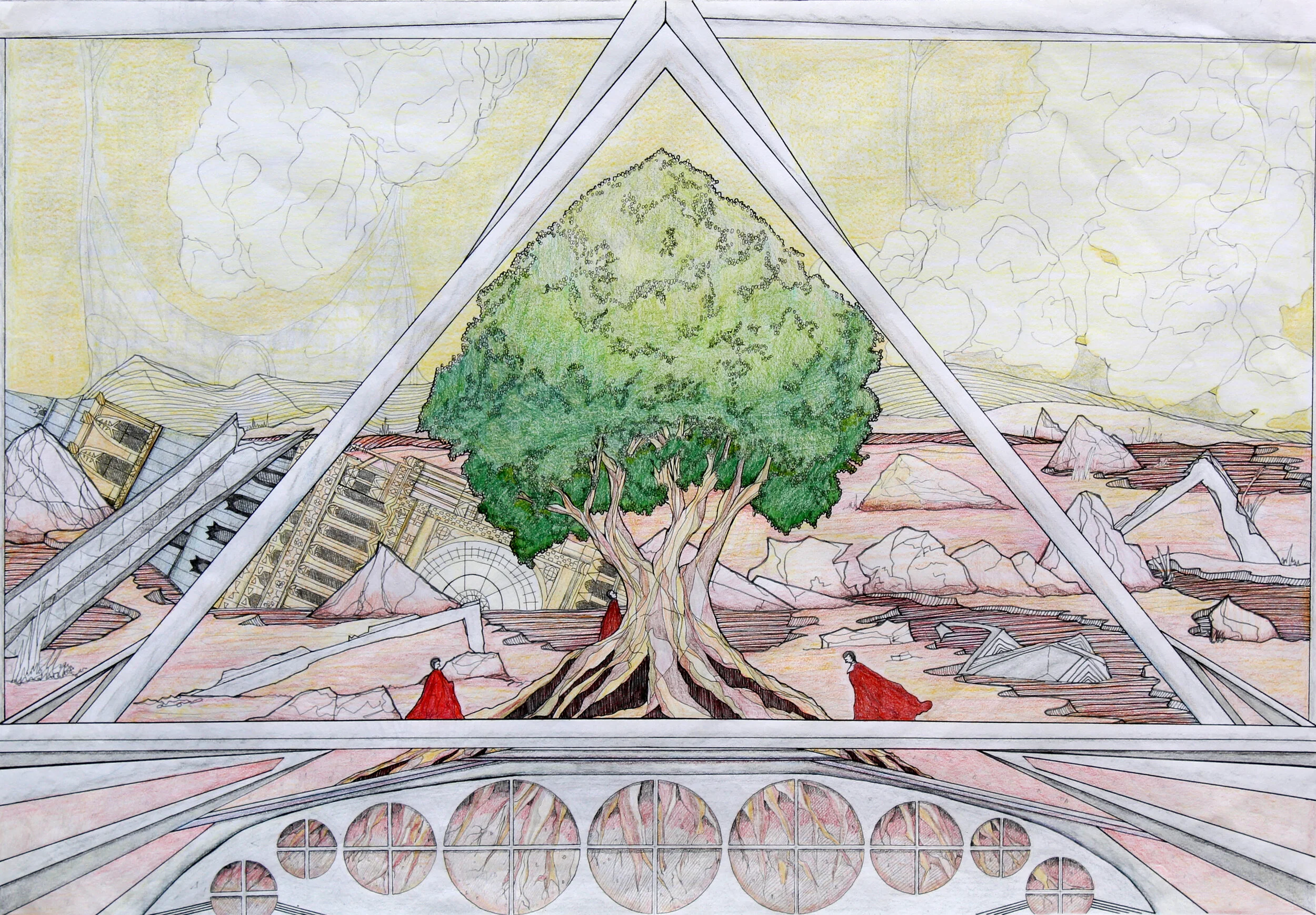 The traveller is a series of drawings in pen and coloured pencil on paper. The series explores the future, 1000 years from now. During the pandemic, I missed travelling and started binging Star Trek (and other sci-fi movies). These pieces are places visited by an interplanetary traveller, visiting earth for the first time. Things are a little different now, as the planet retakes the land. People live closer to nature, recycling old structures. Remnants of automatons, statues and other landmarks still linger. The traveller wonders, “What happened here?”.