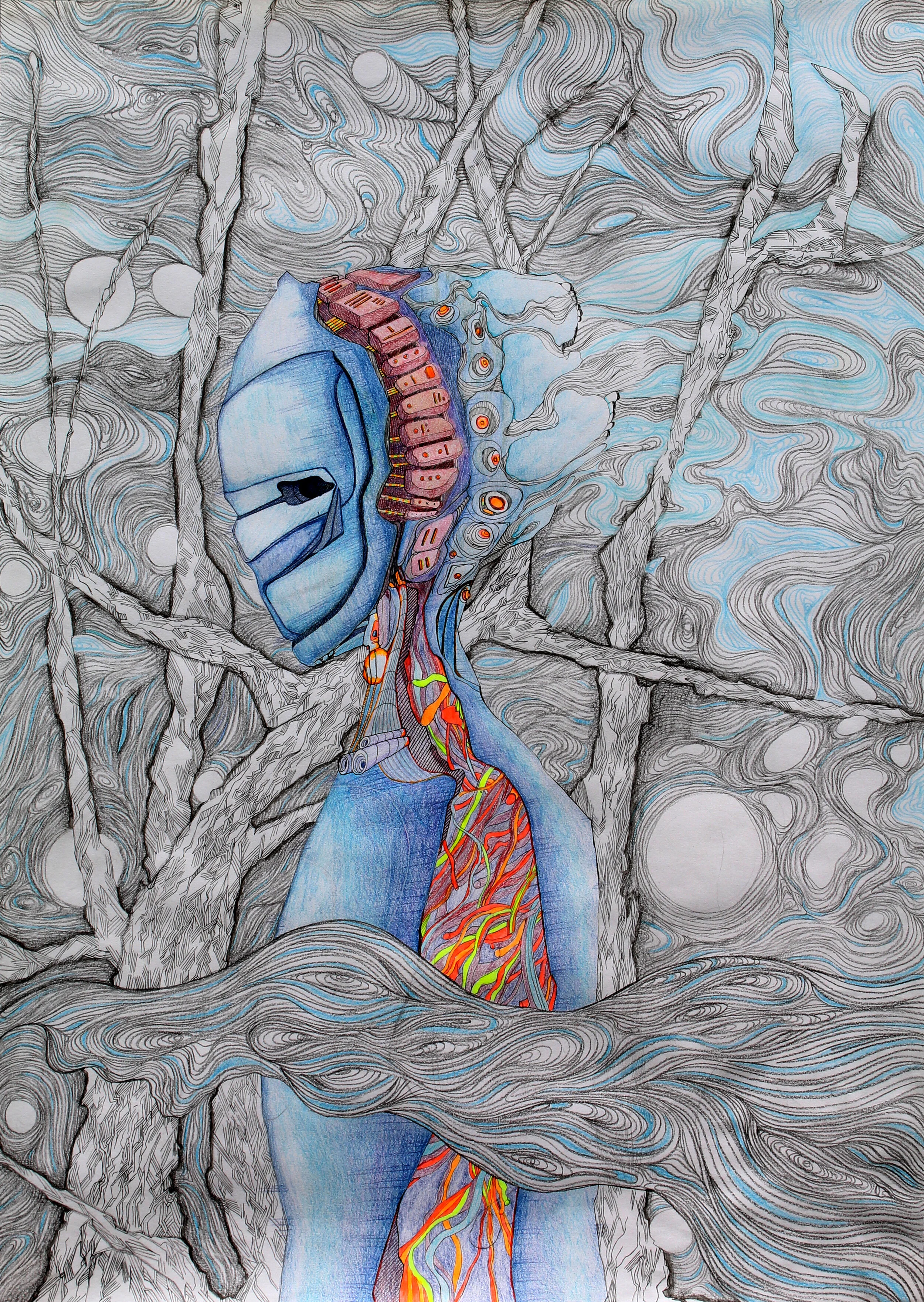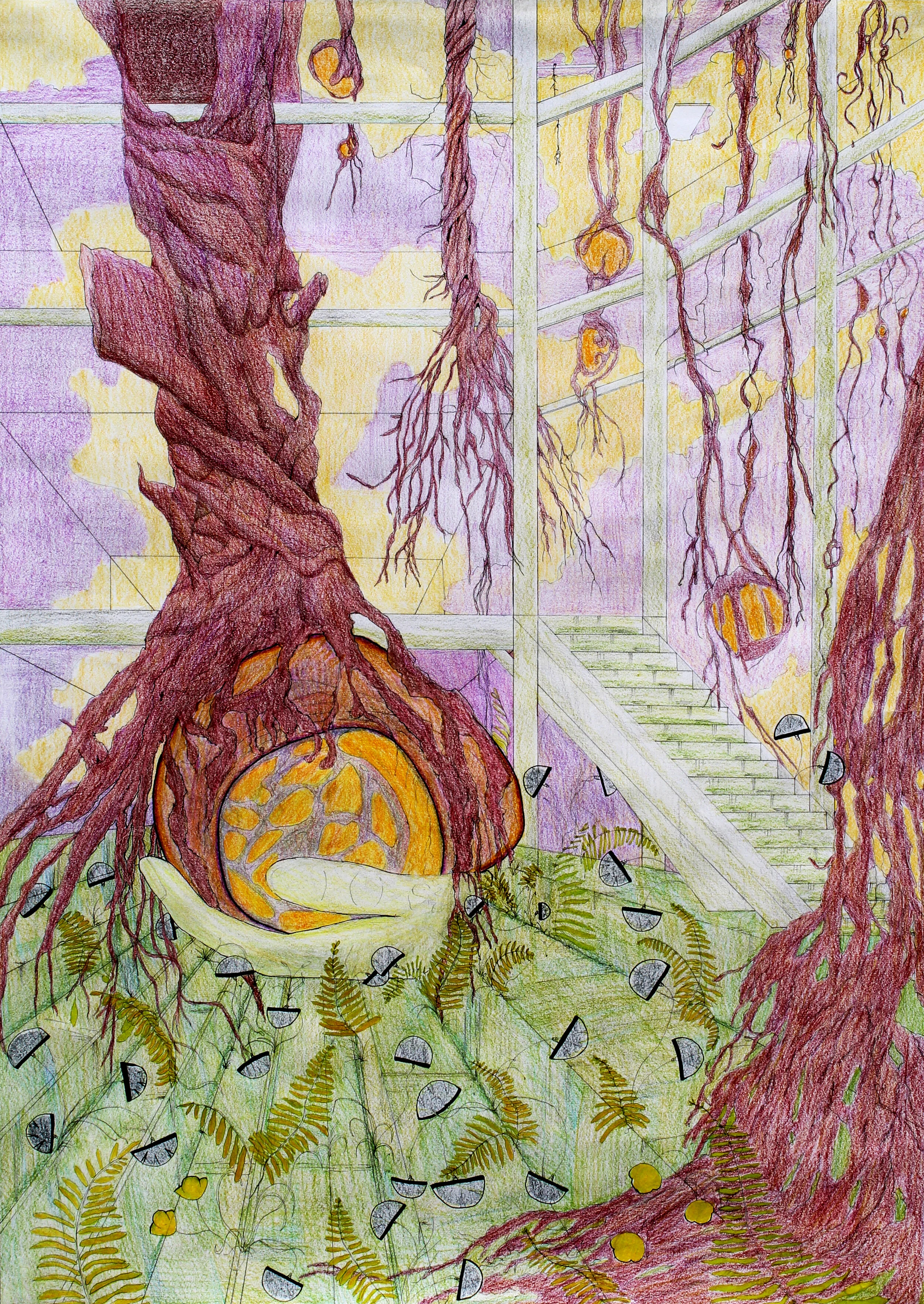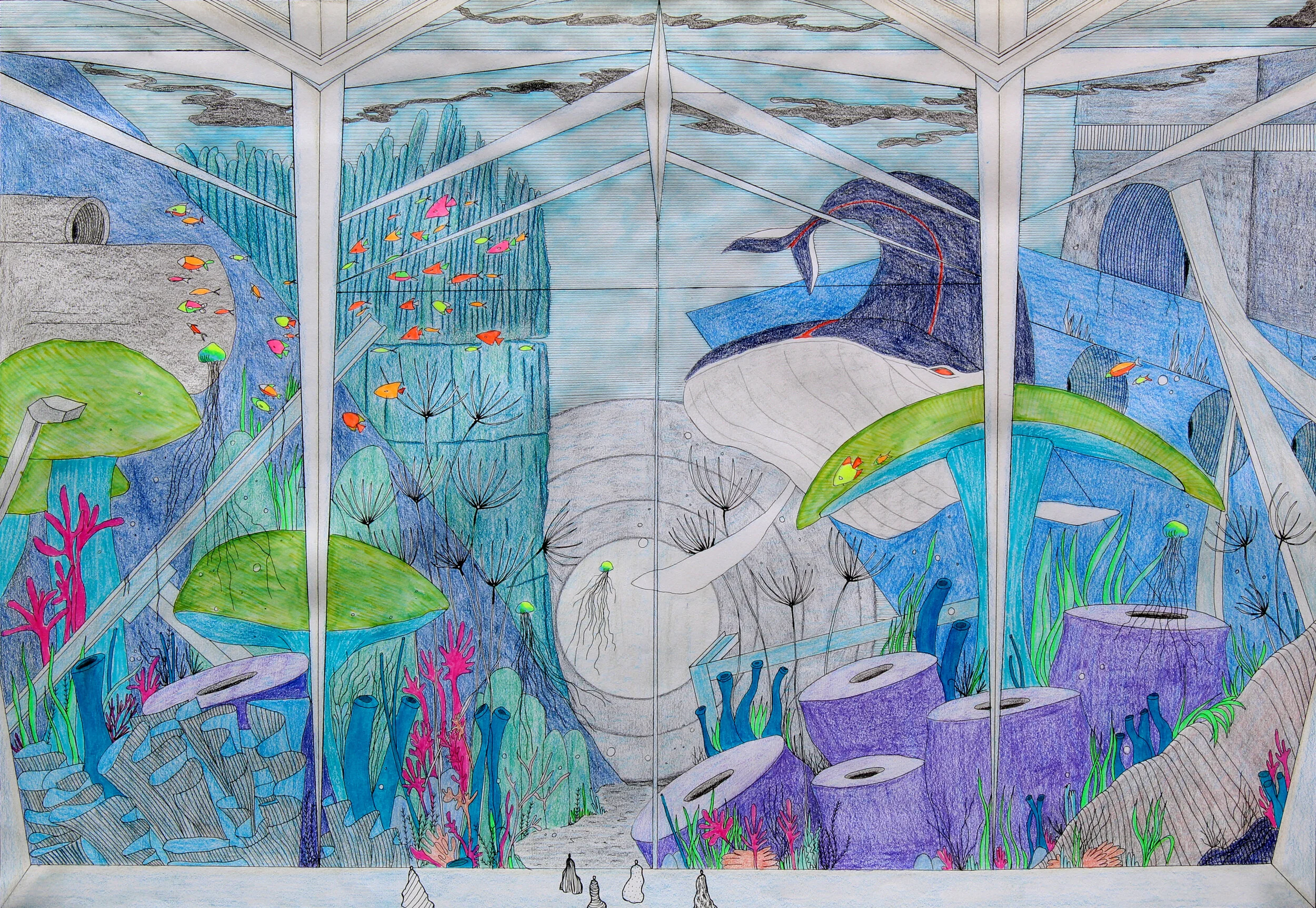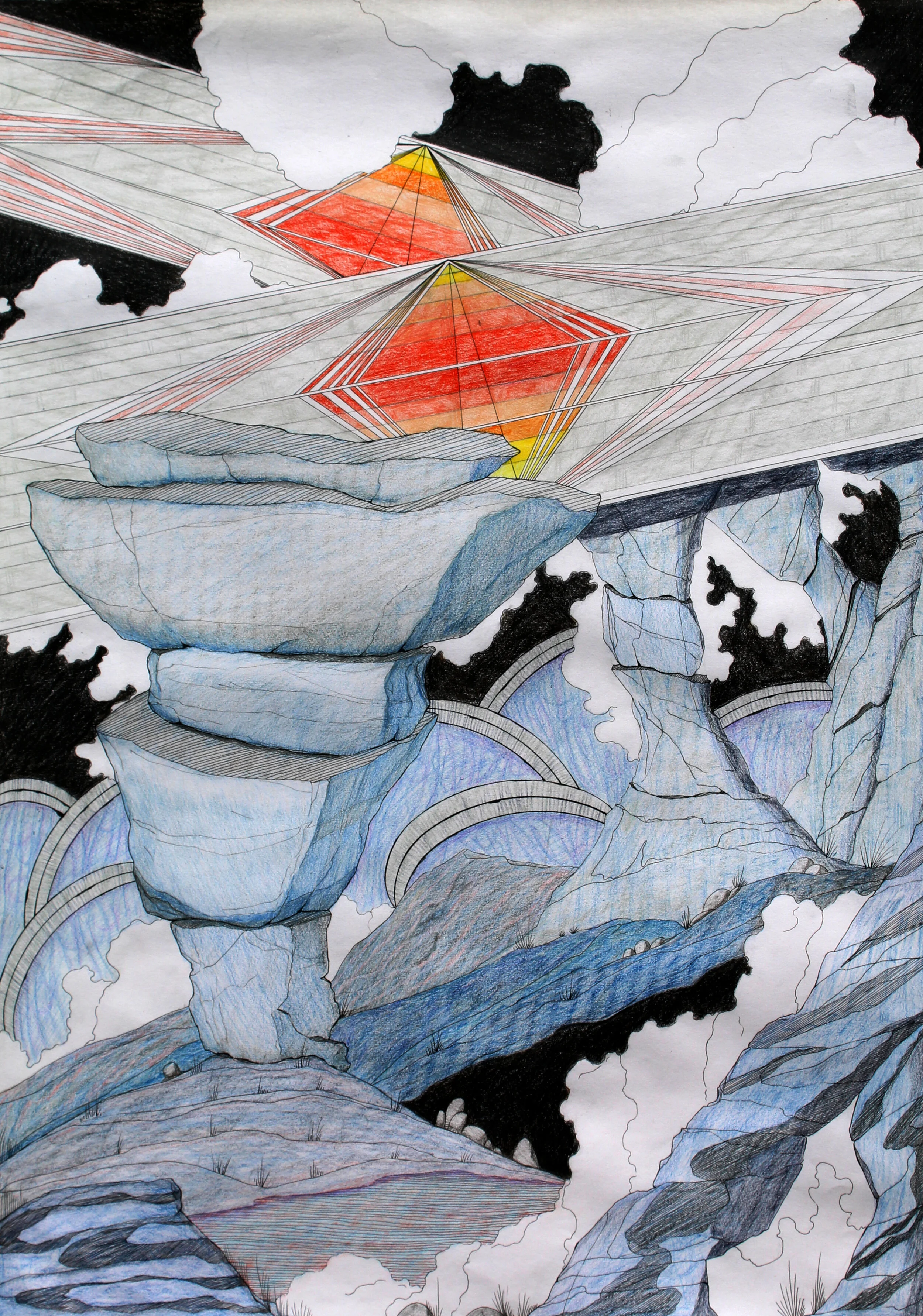 The traveller is a series of drawings in pen and coloured pencil on paper. The series explores the future, 1000 years from now. During the pandemic, I missed travelling and started binging Star Trek (and other sci-fi movies). These pieces are places visited by an interplanetary traveller, visiting earth for the first time. Things are a little different now, as the planet retakes the land. People live closer to nature, recycling old structures. Remnants of automatons, statues and other landmarks still linger. The traveller wonders, “What happened here?”.